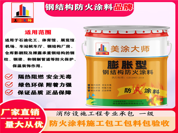 室外超薄型钢结构成武防火涂料是一种由复合材料、阻燃材料、防火填料等组成,并选用最新型的阻燃剂、发泡、发炭、催化剂等加工而成的新型成武防火涂料。该涂料涂层薄、用量少、耐火时间长,粘结力强,耐候、抗冲击、耐冻融性好。并具有较好的耐化工大气腐蚀性,涂层遇火时迅速膨胀增厚,形成发泡致密、均匀的隔热层,延长了耐火时间,从而达到防火保护作用。耐火时间根据等级不同可达0.50 h -2.00 h不等。